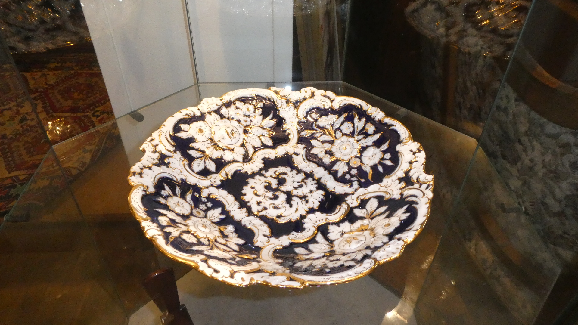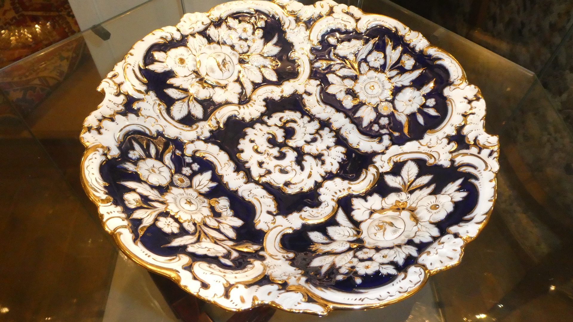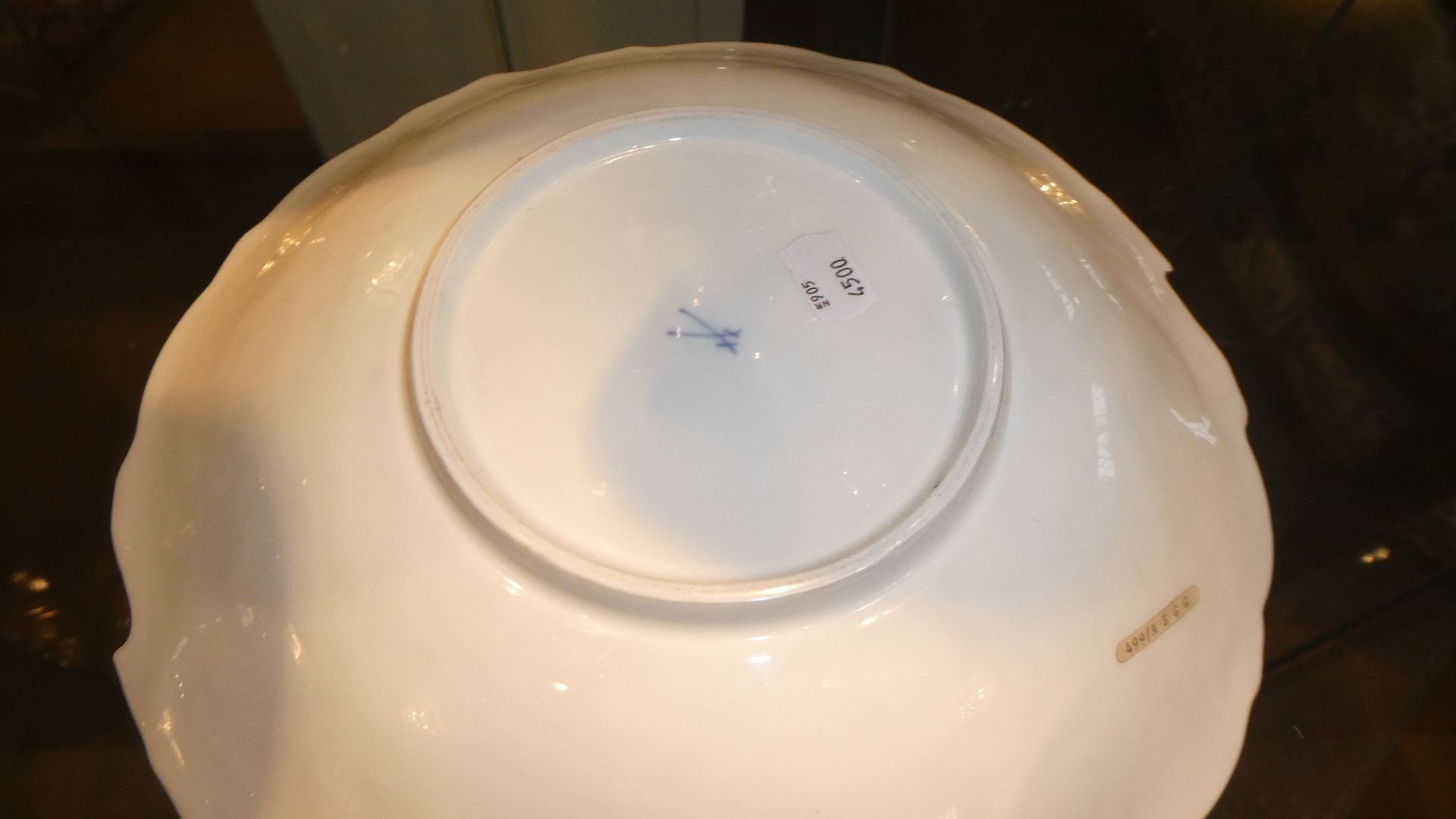 Detta är ett vackert skålfat från Meissen med en reliefdekor av vita blommor med förgyllning mot en blå botten. Den är 6,5 cm hög och 30,5 cm i diameter. Fint skick.